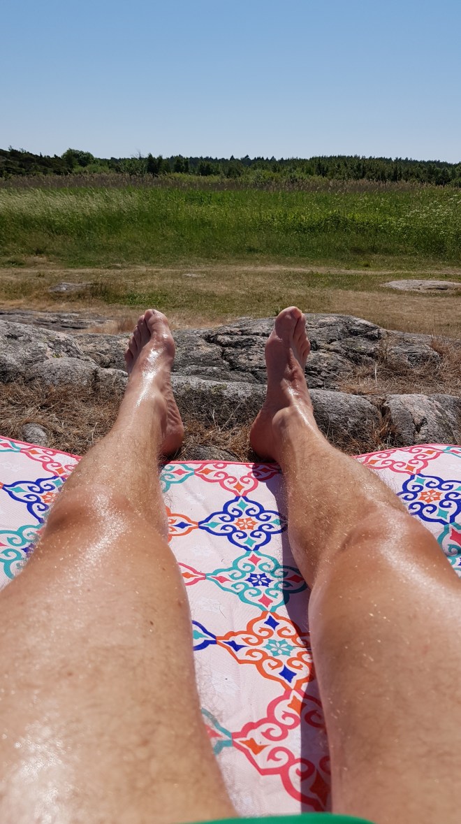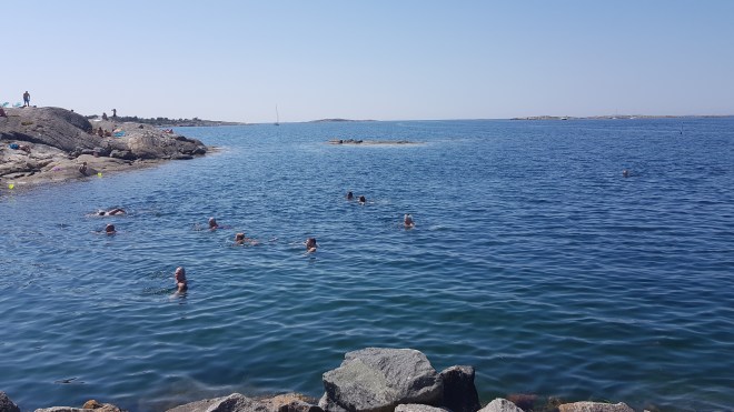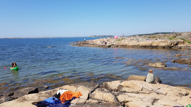 Det är fint på Vallda Sandö. Det finns minst 3 alternativa officiella platser att bada vid. Lagunen, dit du får promenera ca 1 km från parkeringen, bryggan, där det går att hoppa från bryggan. Det finns även uppsatta grillar för badgästerna. Sist men minst badviken nära parkeringen. Ofta fullt med barnfamiljer. Det var där jag la mig först.